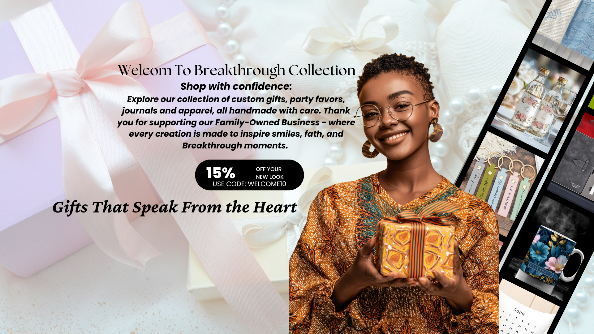 At Breakthrough Collection, we believe that every gift tells a story — one that connects people, sparks emotion, and preserves memories for years to come. Our mission is to help you express love, gratitude, and faith through personalized creations that are just as unique as the people you cherish.